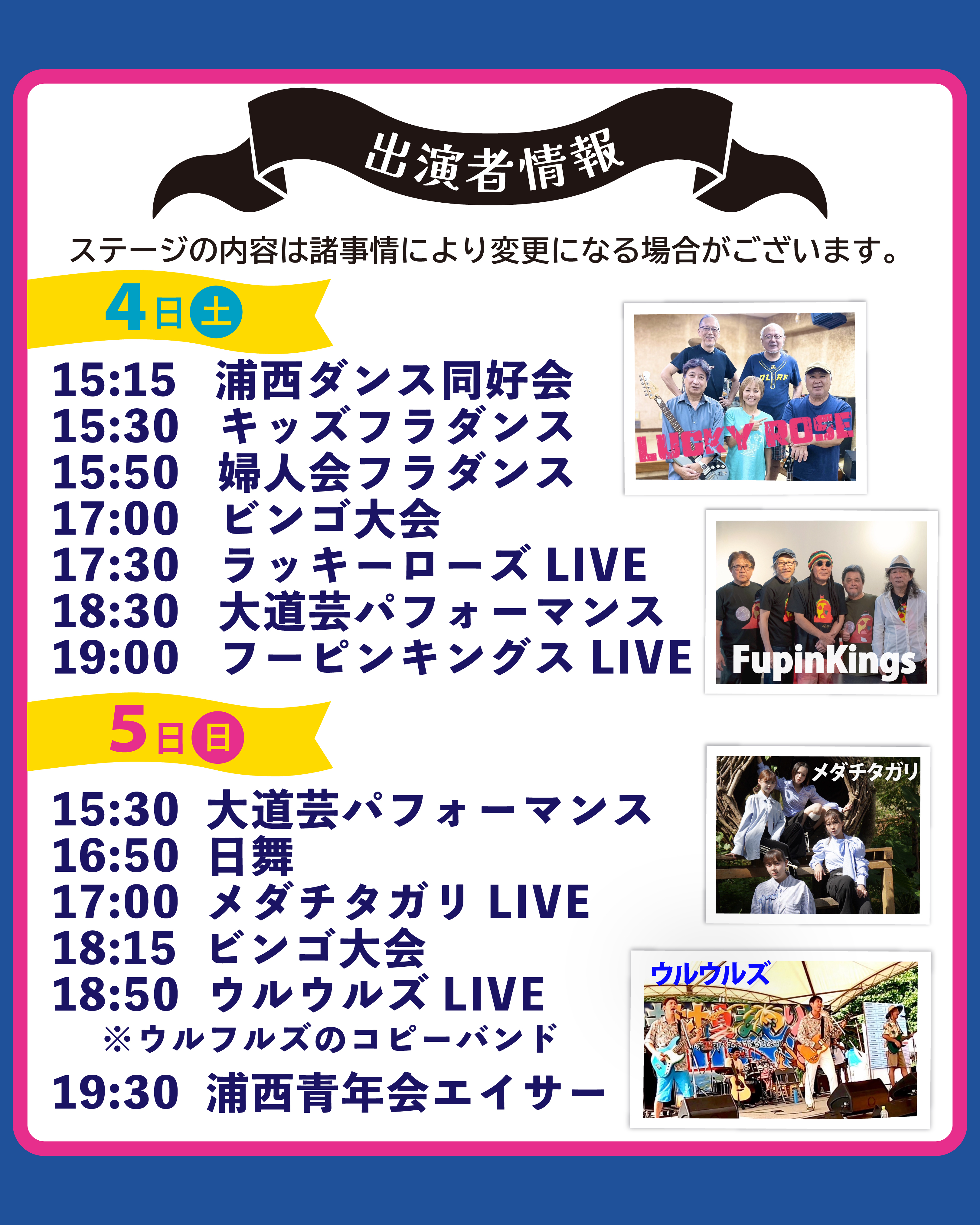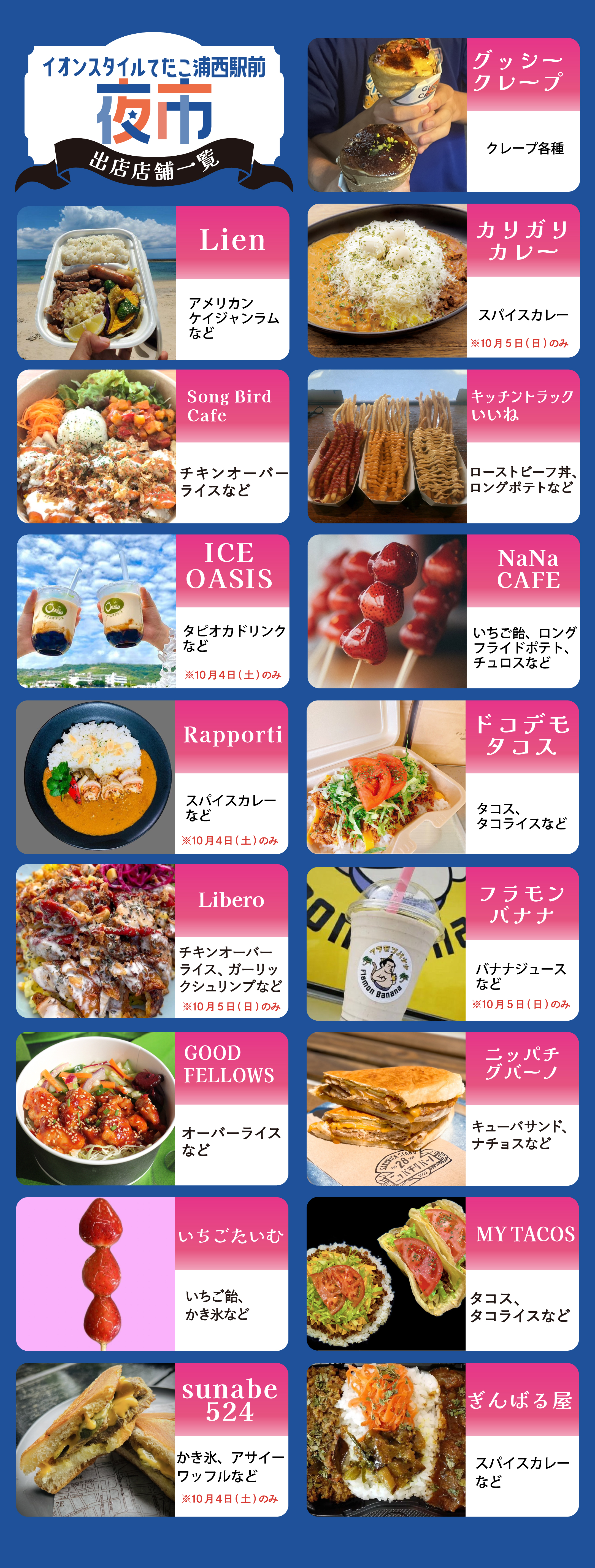 ・内容:人気キッチンカーグルメや、エイサー演舞やダンスパフォーマンスなど、ステージイベント満載!お子様が楽しめるエアー遊具や縁日コーナーもございます!