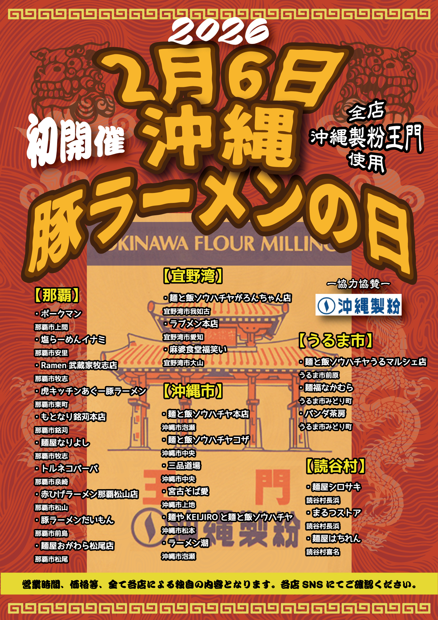 初開催となる2026年2月6日には、沖縄県内のラーメン店を中心とした25店舗が参加し、1日限定でオリジナル「沖縄豚ラーメン」を販売する!