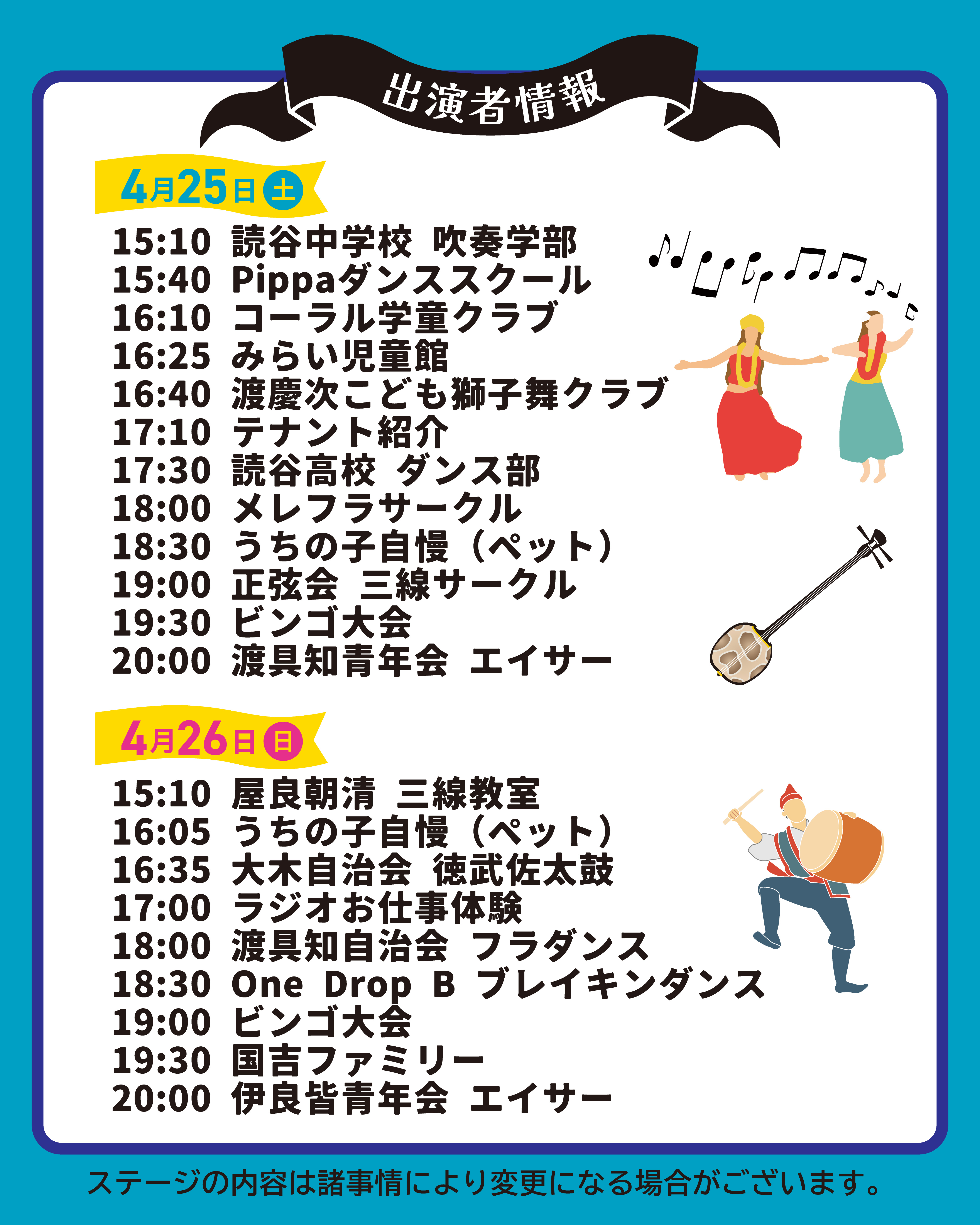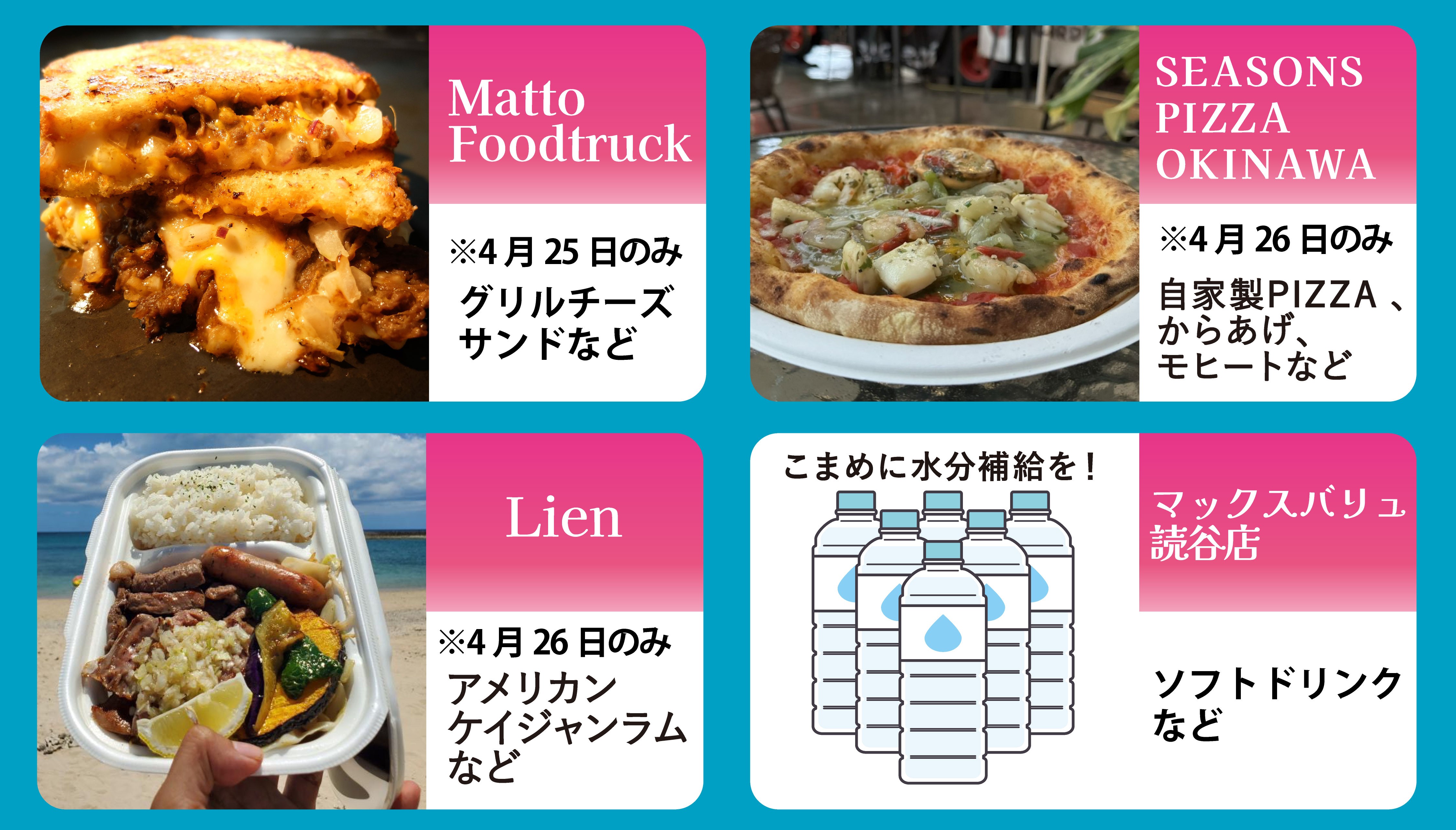 読谷村内の企業であるオキハムの厳選グルメや、キッチンカーグルメが勢揃い!読谷村青年会によるエイサー演舞や、地元団体のステージショーも盛りだくさん!
